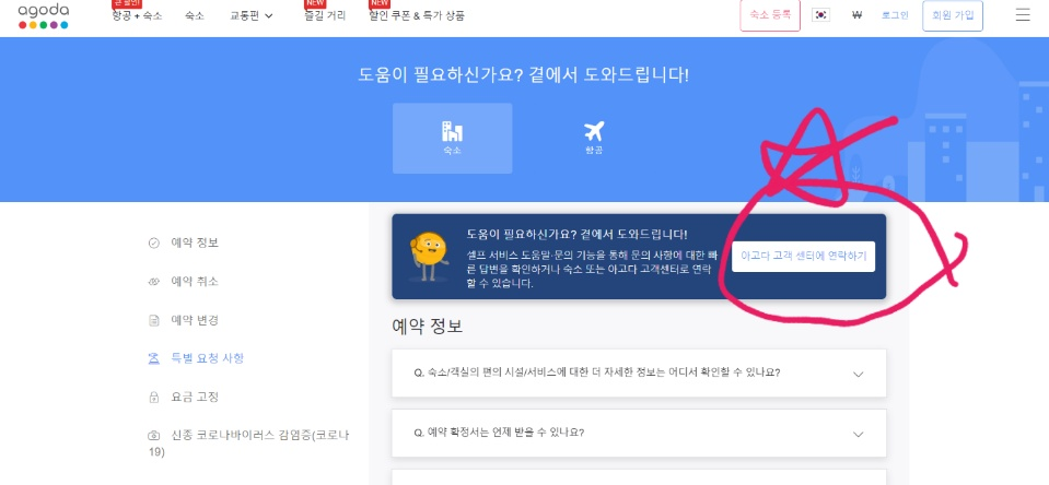제가 빨간색 별표 쳐놓은 "아고다 고객센터에 연락하기" 클릭하시면,